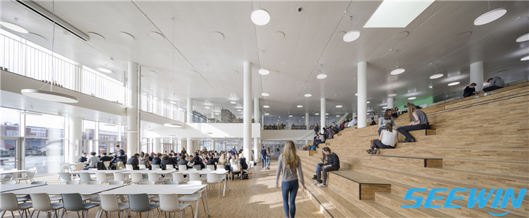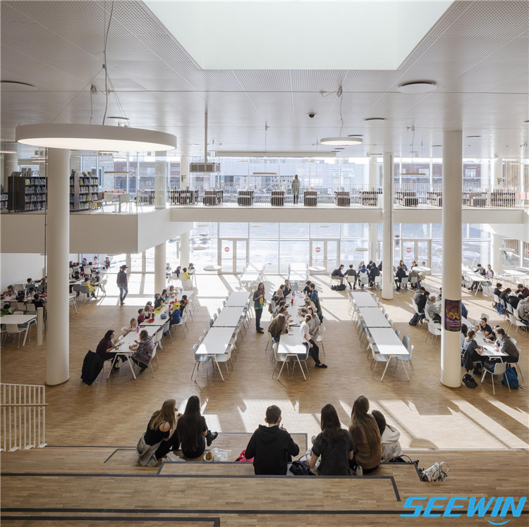 學(xué)校簡(jiǎn)介:哥本哈根國(guó)際學(xué)校位于哥本哈根新的 Nordhavn 區(qū)的一個(gè)重要位置。它占地2.5萬平方米,是哥本哈根最大的學(xué)校,可容納1,200名學(xué)生和280名教職工。四個(gè)單元都建在一樓的基地之上,這個(gè)一樓所容納的活動(dòng)更為常見和外向,包括一個(gè)大廳、食堂、圖書館和各種體育、表演設(shè)施。因此,教室可以在休息時(shí)間關(guān)閉,而公共區(qū)域仍將保持開放,以供舉行學(xué)校和當(dāng)?shù)氐幕顒?dòng)。小編將為您展示這所國(guó)際學(xué)校餐廳家具的配置方案。