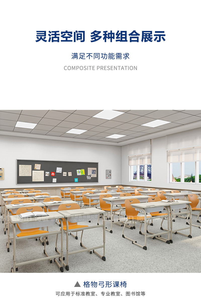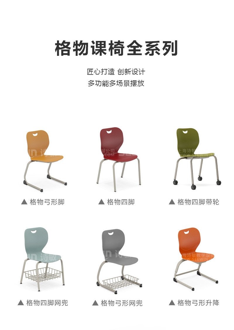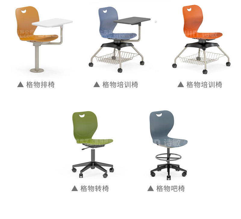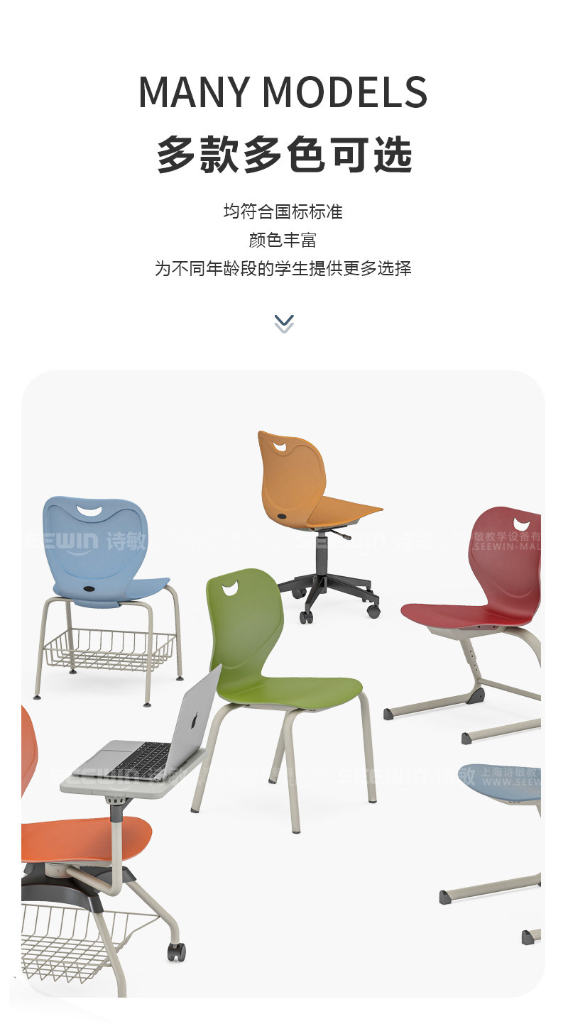 SEEWIN詩敏學(xué)校家具格物系列學(xué)生課椅采用ABS注塑一次成型; 鋼管采用橢圓管滿焊焊接、表面采用高溫粉體烤漆,耐腐蝕、不易生銹。 4種椅腳可供選擇,適用于教室、培訓(xùn)室、圖書館等多種場合; 椅背和椅座的凹陷處理,更貼合人體曲線,幫助學(xué)生培養(yǎng)健康坐姿; 多種顏色可選,滿足您不同需求的搭配。