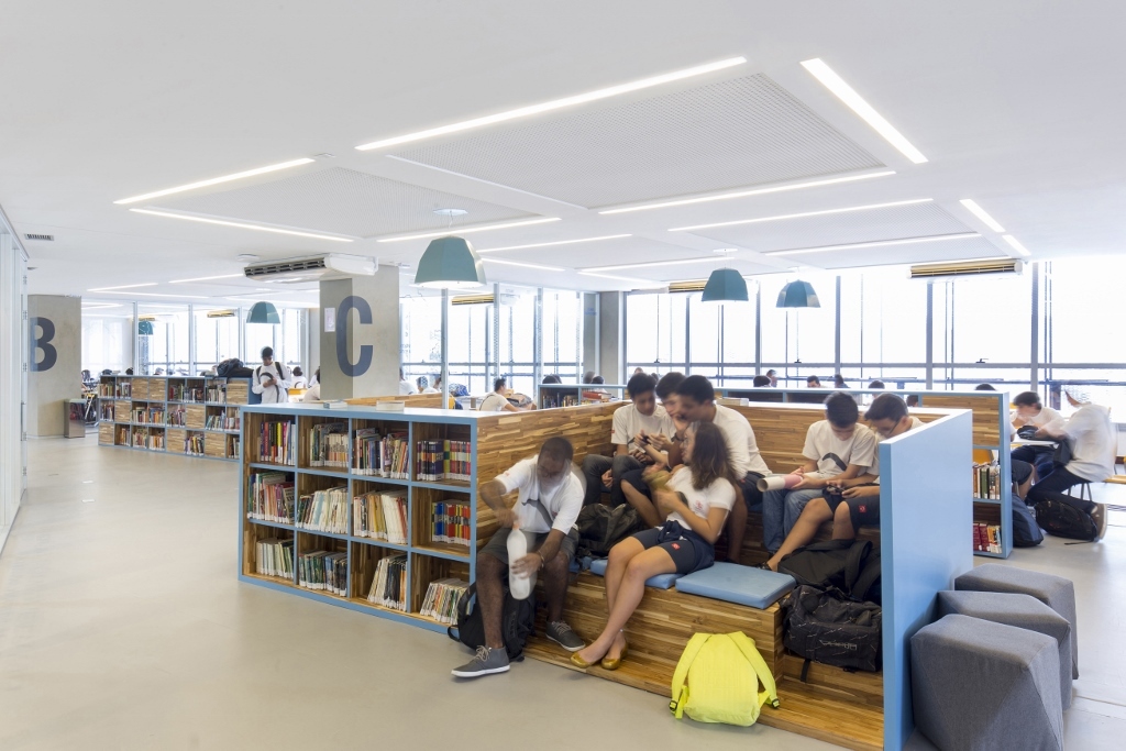 Bradesco 基金高中利用建設(shè)性的資源,為由銀行改建過(guò)來(lái)的建筑提供新的特性和生活,以適應(yīng)教育設(shè)施,打造綜合學(xué)??臻g。SEEWIN詩(shī)敏家具為您帶來(lái)巴西Bradesco 基金高中教學(xué)空間分享